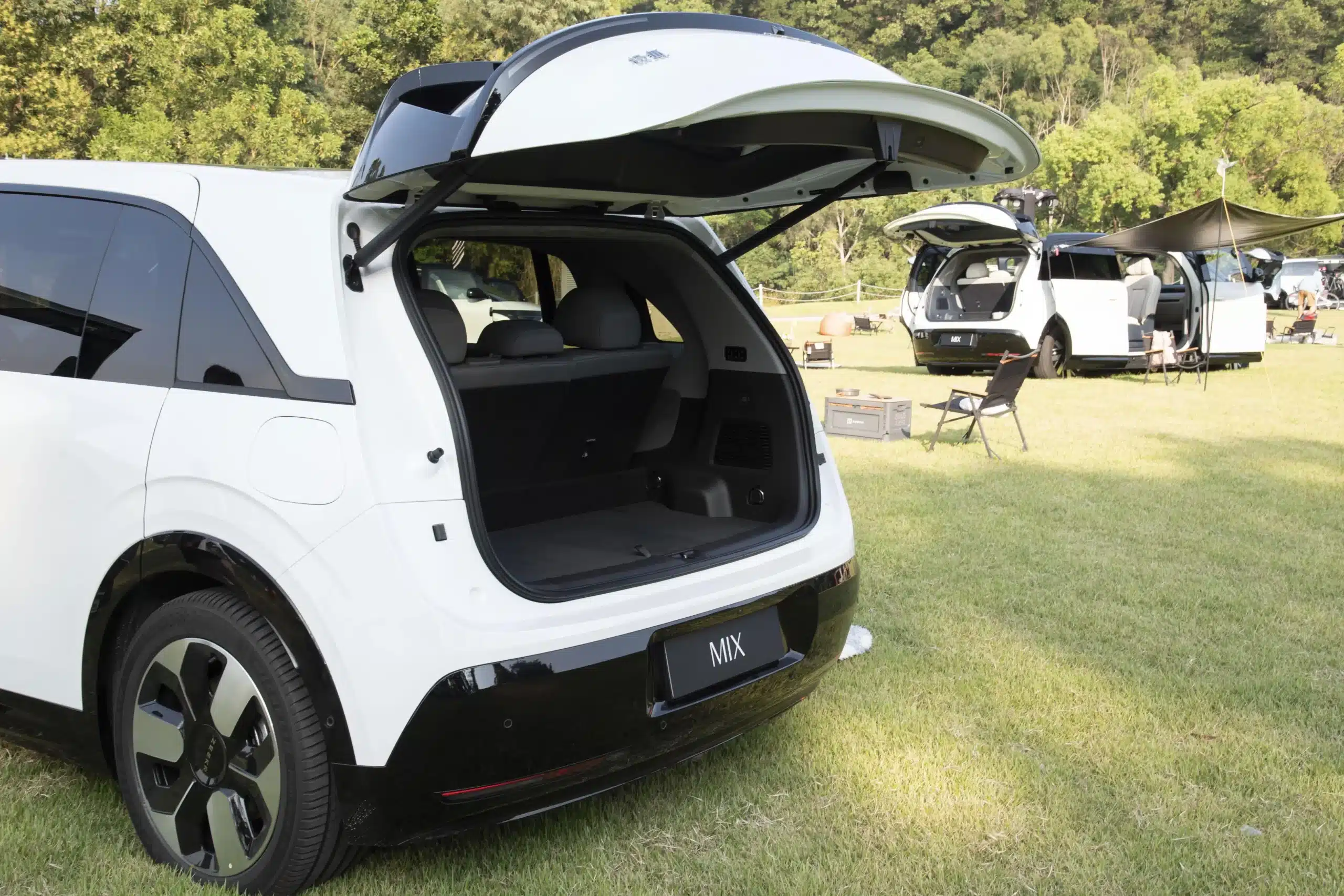 The side profile of the Zeekr MIX is rounded, with a hidden double B-pillar electric split door design, electric exterior mirrors (with heating/electric folding/memory/automatic flip when reversing), semi-hidden exterior door handles (with smart micro switches) and four-door electric release switches (with emergency unlocking function). The new car has a large triangular window behind the A-pillar, and the second/third row and rear windows are equipped with privacy glass.